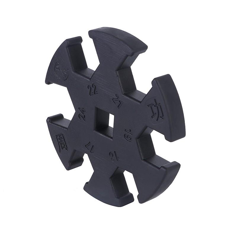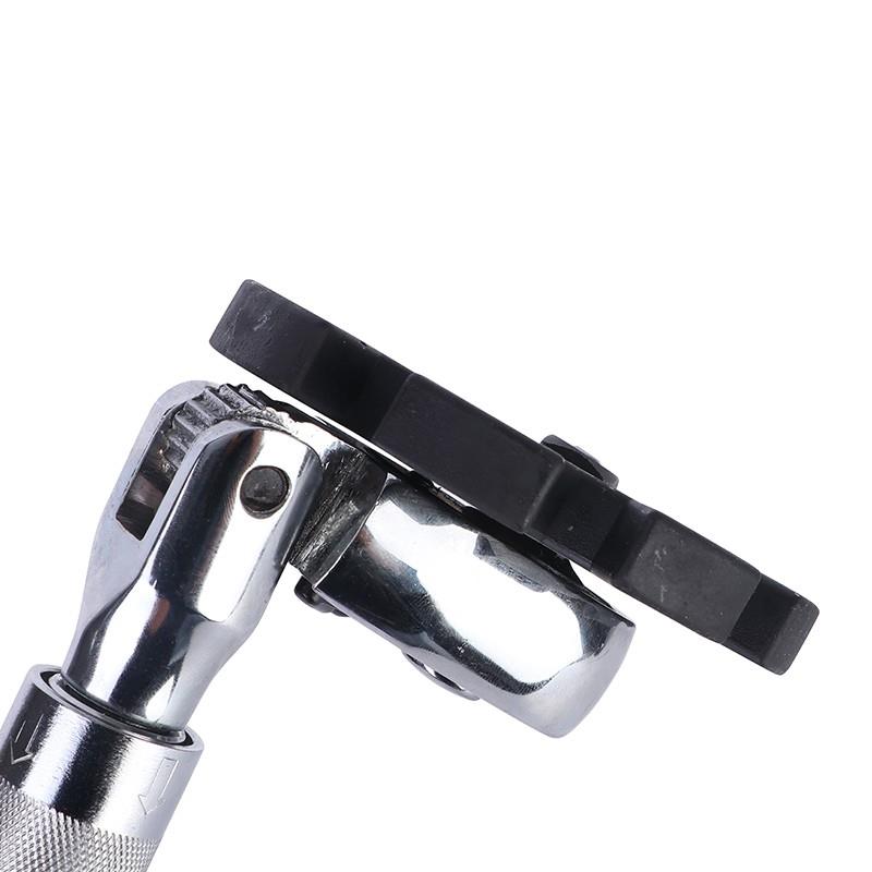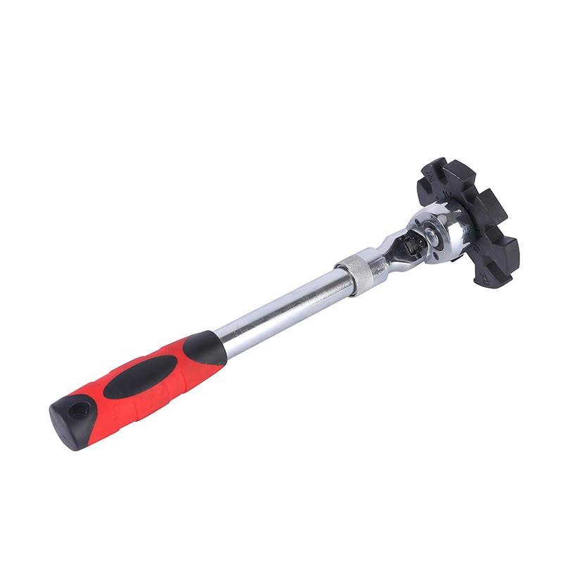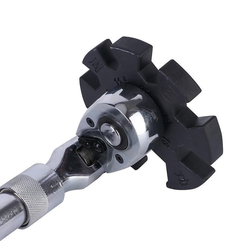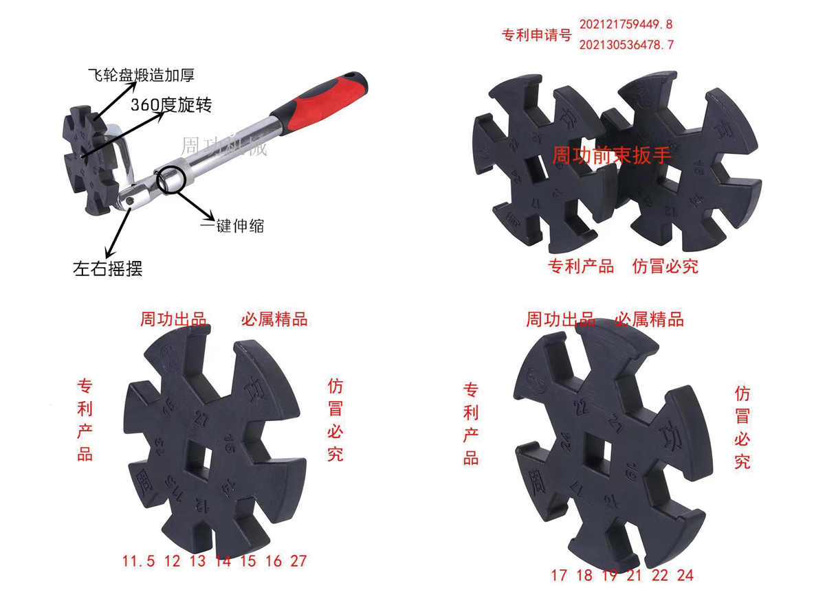 做四輪定位用的開口扳手很容易會開口,滑落傷到技師的手,而且新手用多大的扳手也不知道,拿一個扳手拿錯了好幾次,開口扳手在狹小的空間又很難用上力,所以我們做了一個倒鉤槽防滑落、再加360度旋轉(zhuǎn)和90度左右搖擺、不滑落又能用上力,只要一把扳手難拆銹死的前束螺絲就迎刃而解了。